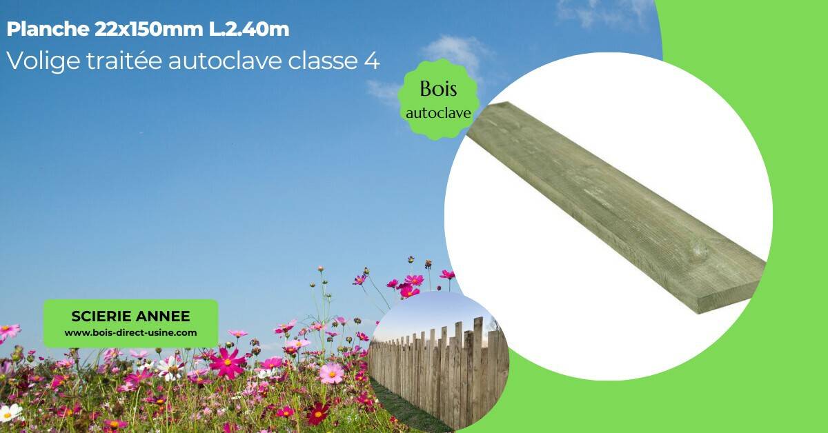 Description et caractéristiques Planche 22x150mm L.2.40m volige Pin traité autoclave classe 4